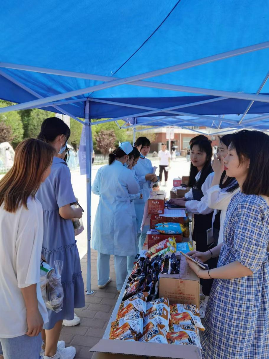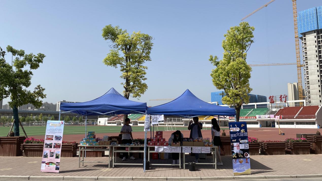 5月8日,电商工作室孵化的蜜蜂主播们迎来了他们的一周岁,工作室的师生在学校操场旁搭起帐篷、摆上脆枣、面筋、山药片等零食小吃,进行了一场“一周岁粉丝回馈活动”,本次活动的产品来自绿领农副产品有限公司,是我校与开封市祥符区开展校地合作中的一家乡镇企业。