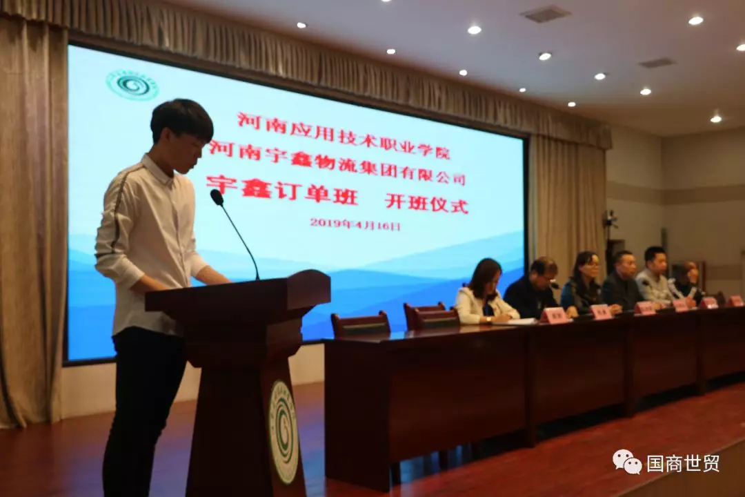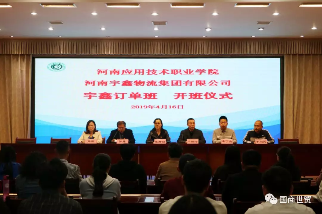2019年4月16日,我校yl6809永利官网集团与河南宇鑫物流有限公司举行了校企合作“宇鑫订单班”开班仪式。开班仪式在我校实训中心二楼会议室进行,学校党委委员陈君丽院长,校就业办李向民主任、yl6809永利官网集团党总支周燕书记,宇鑫物流集团人力资源总监闫新法同志、人力资源经理李丁杰同志出席。开班仪式yl6809永利官网集团孙勇院长主持,物流专业全体学生及yl6809永利官网集团老师参加。