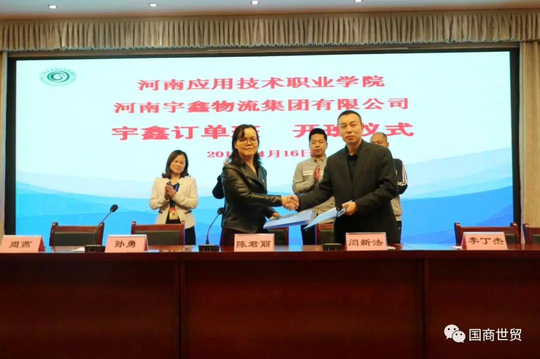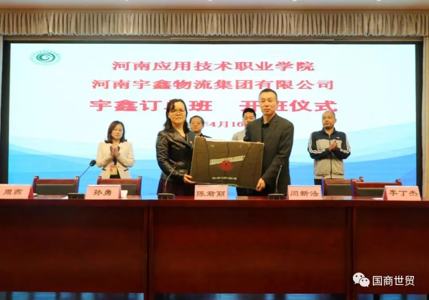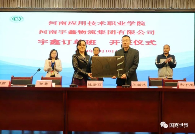 此后,我校副院长陈君丽与宇鑫物流集团人力资源总监闫新法签订校企合作协议,并进行了授牌仪式。