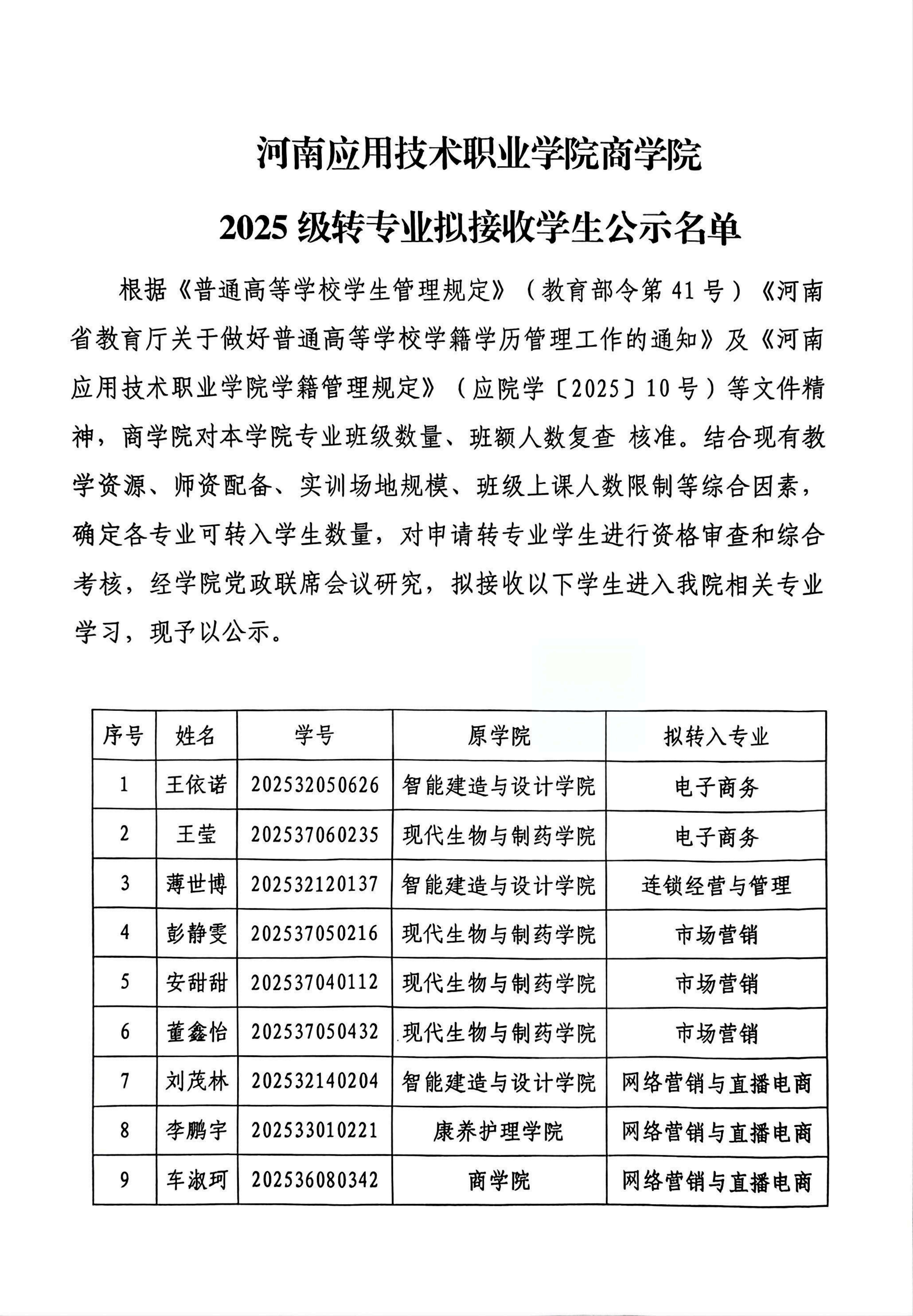 yl6809永利官网集团 2025级转专业拟接收学生公示名单
