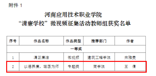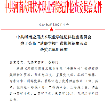 近日,学校纪律检查委员会下发了《yl6809永利集团“清廉学校”微视频征集活动》的通知,经过专家评审、网络投票等环节,最终我院师生拍摄的清廉作品获教师组一等奖专题类1项,学生组二等奖专题类1项,纪实类1项。