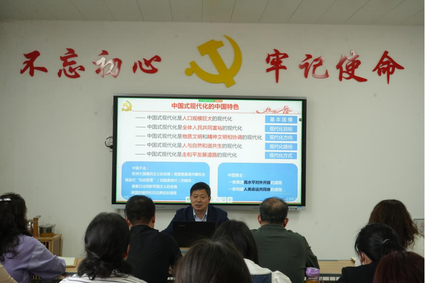 刘振民从“中国式现代化理论体系的基本构成”、“以中国式现代化实现中华民族伟大复兴的根本保障”两大方面,用近两个小时的时间进行了阐述,为师生党员带来了一堂深入浅出、意蕴深远的主题党课。从中国式现代化的根本性质、根本遵循、鲜明特色、世界意义等九个方面,全面深入的讲解了中国式现代化理论体系的基本构成;从“两个确立”、“四个意识”、“四个自信”、“两个维护”上彻底解决以中国式现代化实现中华民族伟大复兴的根本保障问题。古今对照、中外对比,既有国际局势的深入解读,又有我国人民利益至上、共同富裕现代化的呈现;既有整个国际国内经济局势的分析,又有yl6809永利官网集团实践教学活动的经验分享与肯定,整个党课具有对比研究、以小见大、透过现象看本质的特点,激发了教师学生的爱国心与奋斗的激情,取得了明显的效果。