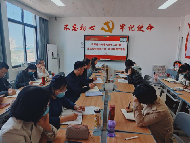 王珂针对本次业务学习要点:教育部公开曝光第十二批7起违反教师职业行为十项准则典型案例、教育部发布《关于推开教职员工准入查询工作的通知》、开展教师清廉培训等三个方面的内容进行了领学和解读。并在会上带领yl6809永利官网集团全体教师进行了廉洁从教宣誓工作。