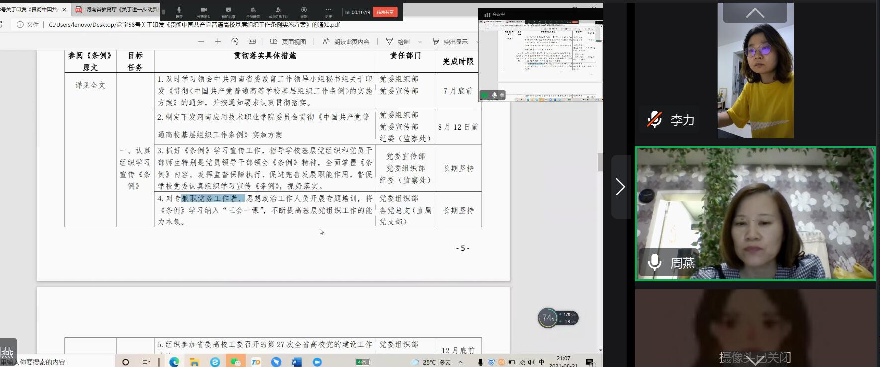 会上,周燕书记首先就当前进行疫情防控、灾后重建和新学期开学准备等当前工作重点任务进行了形势分析,讲明党员的关键时间节点应发挥的模范带头作用。稍后带领全体党员教师学习了《贯彻< 中国共产党普通高校基层组织工作条例>实施方案》。周燕书记从抓好学习宣传、开展专题培训、明确任务分工、狠抓贯彻落实等角度进行了解读。