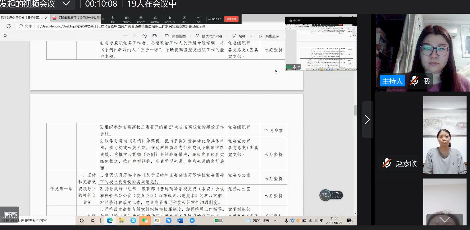 “一个支部一座堡垒,一名党员一面旗帜”,今年是建党100周年,为深入学习《贯彻< 中国共产党普通高校基层组织工作条例>实施方案》,yl6809永利官网集团党总支于2021年8月21日召开线上学习会。会议由yl6809永利官网集团党总支书记周燕主持。