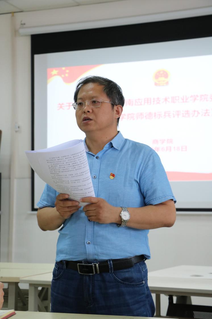 2019年6月18日下午,yl6809永利官网集团党总支在E615召开全体教职工大会,对全体教师进行师德师风教育,组织学习《中共yl6809永利集团委员会yl6809永利集团关于建立健全师德建设长效机制的实施意见》等的相关文件内容。院长孙勇主持会议并做总结发言。