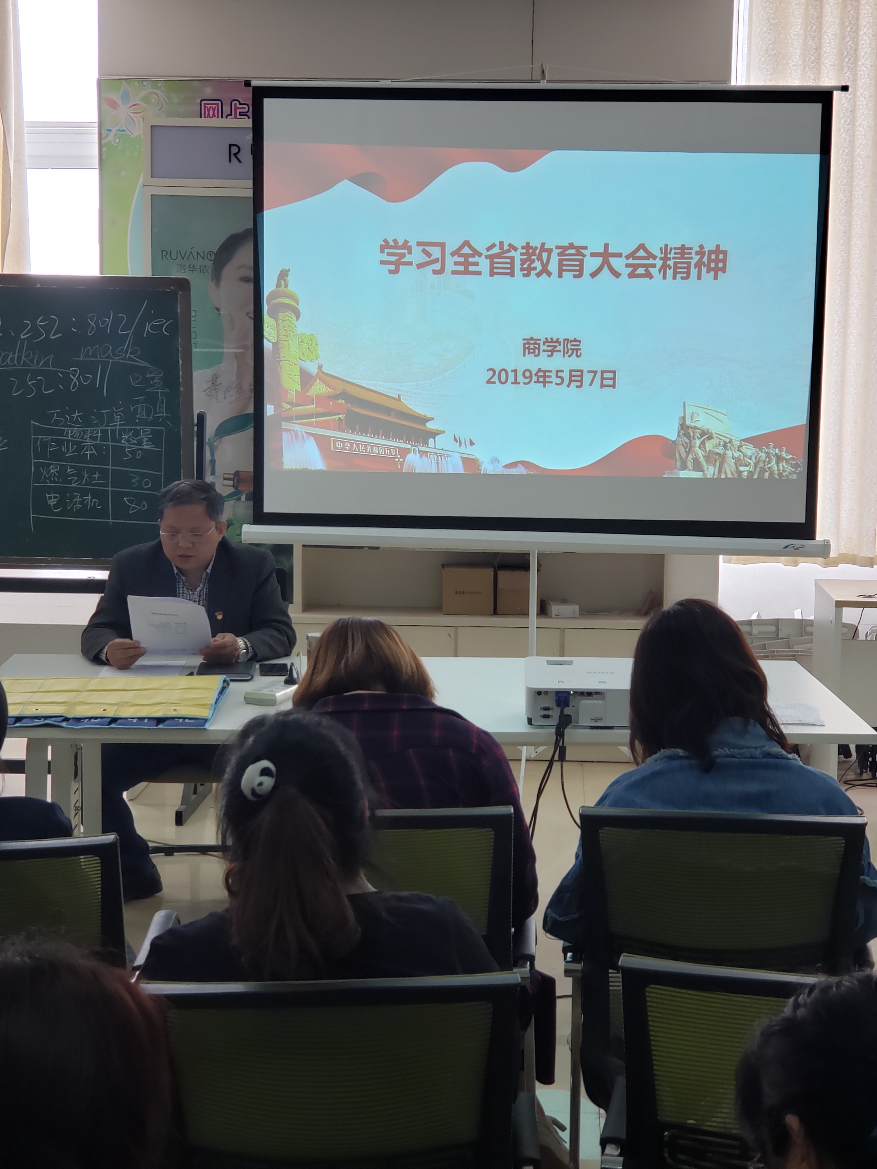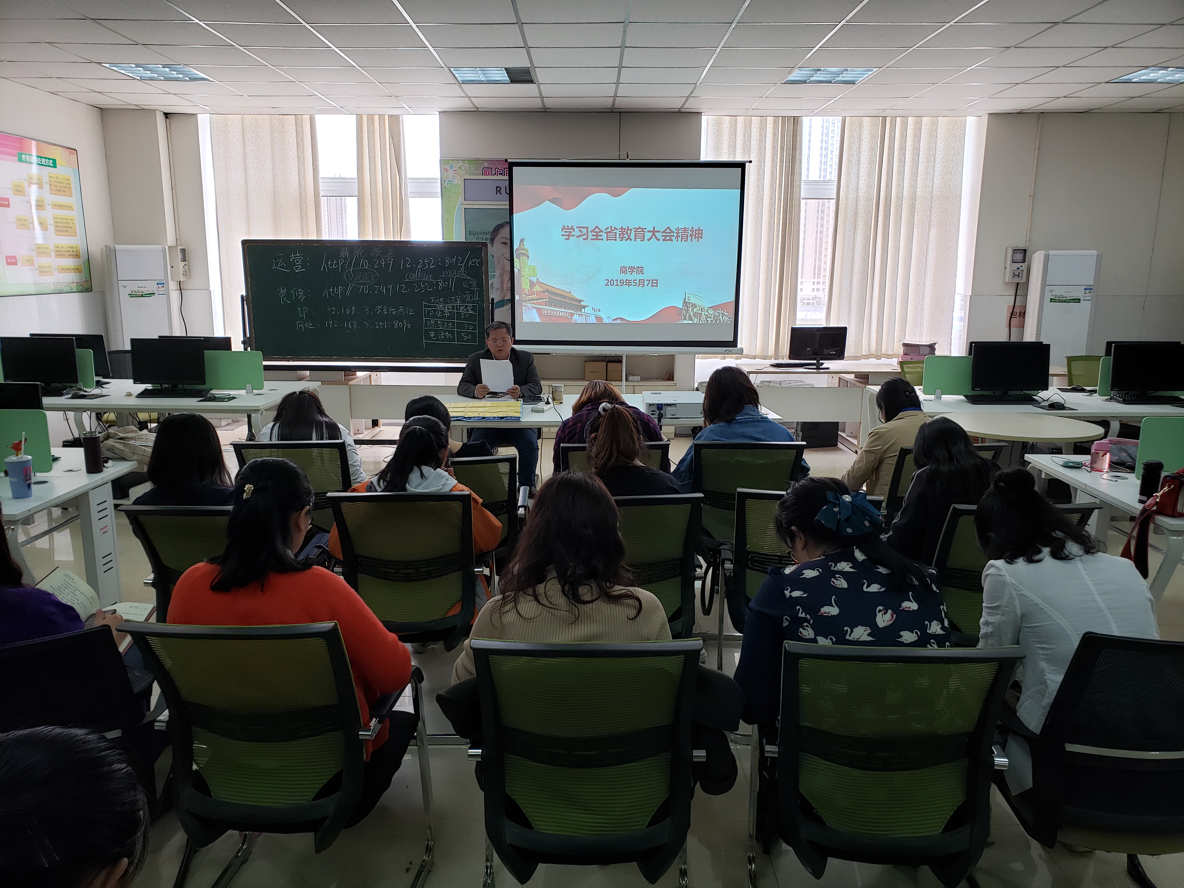 2019年5月7日,yl6809永利官网集团全体教职工在E609教室学习全省教育大会精神。yl6809永利官网集团院长孙勇同志主持会议。
