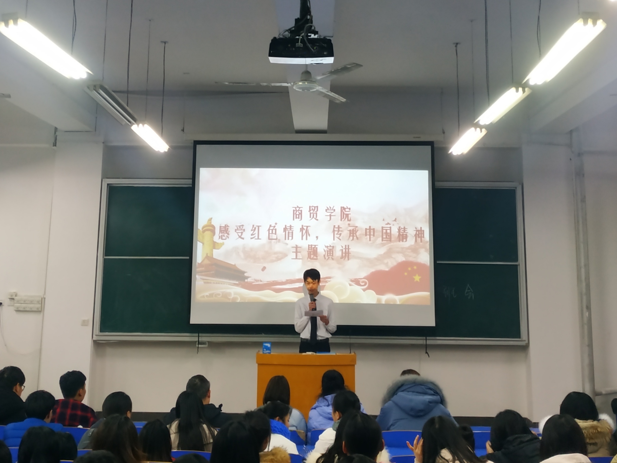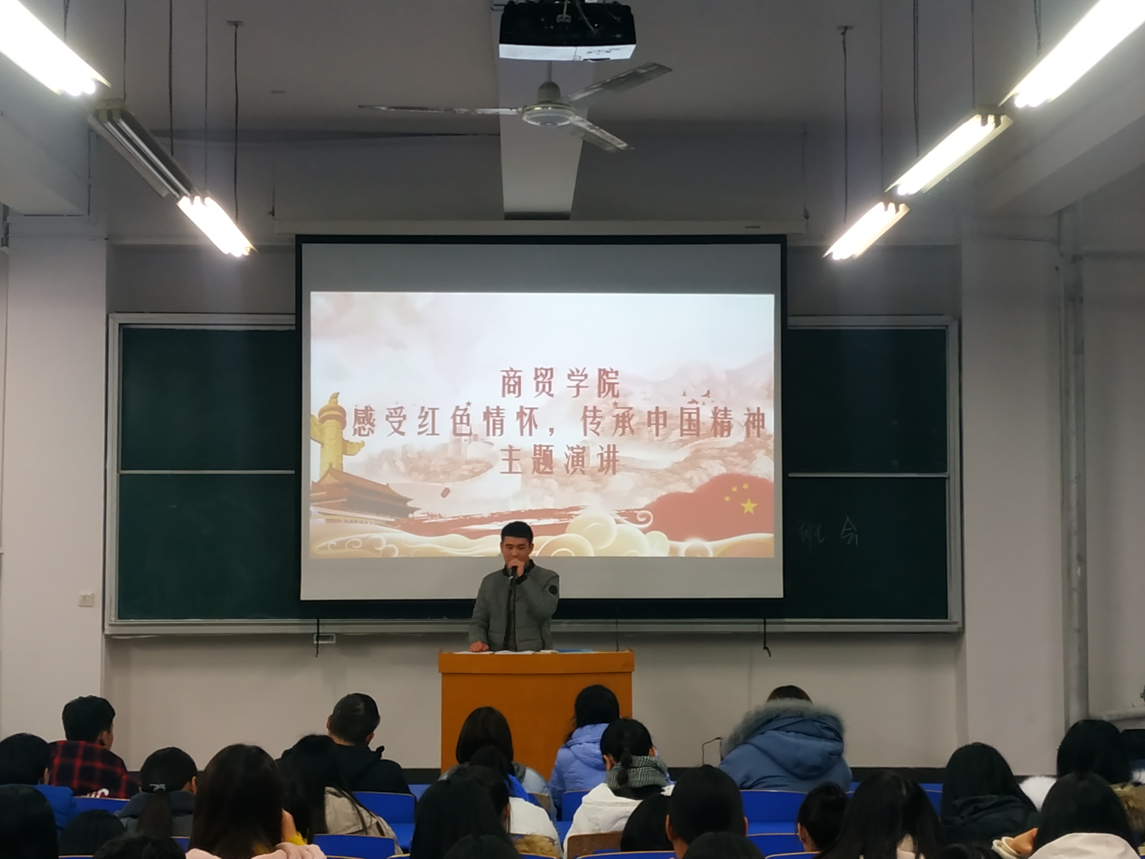 2018年12月27日在b201开展的《感受红色情怀,传承中国精神》演讲比赛,由商贸学院李力老师、刘嘉慧老师、岳晓娜老师、朱海老师担任此次大赛评委,商贸学院全体入党积极分子参加活动。