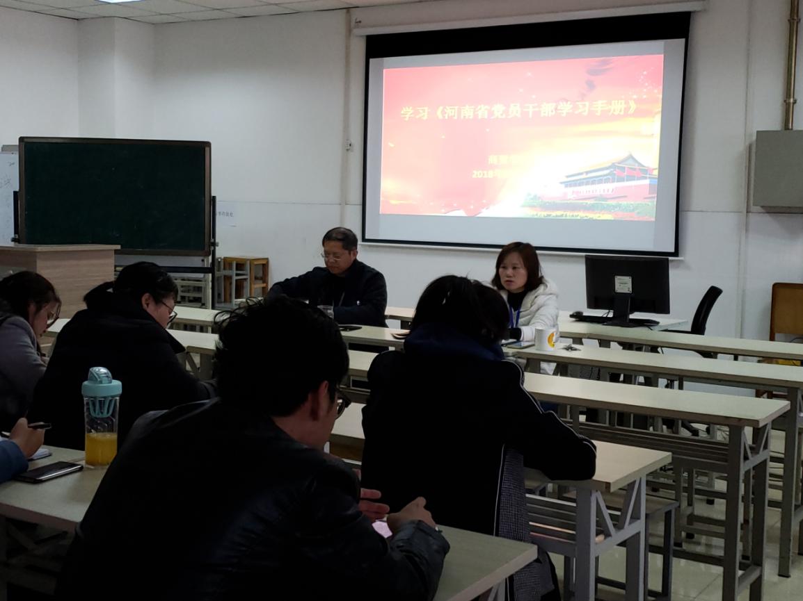 为深入贯彻落实习近平新时代中国特色社会主义思想和党的十九大精神,提升党员干部政治理论素养,11月6日下午商贸学院党总支组织学习了《河南省党员干部学习手册》。学习由党总支书记周燕主持,商贸学院全体教师参加。