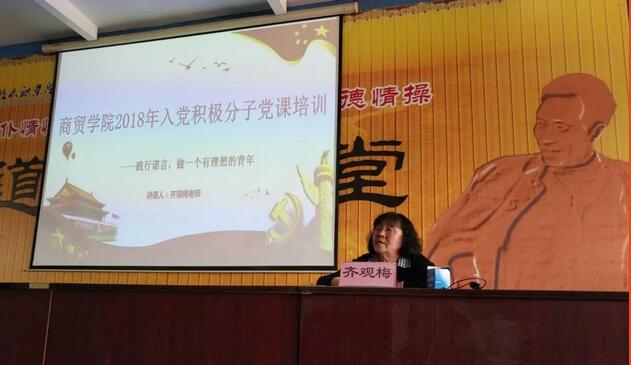 2018年5月23日,我校齐观梅老师在B楼202为商贸学院教师、学生入党积极分子开展了一次生动的党课教育,商贸学院党总支书记周燕同志主持会议。齐老师以“践行诺言,做一个有理想的青年”为主题,探讨了在新时代要如何继承和弘扬中国共产党精神。