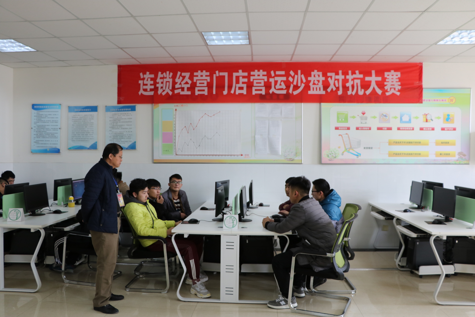 11月22日,我院连锁经营门店运营沙盘对抗赛在E609举行,本次的比赛是由16级连锁专业的学生参加,通过一个多月时间的培训和训练,最终在比赛中评选出一等奖1组,二等奖1组、三等奖2组的成绩。