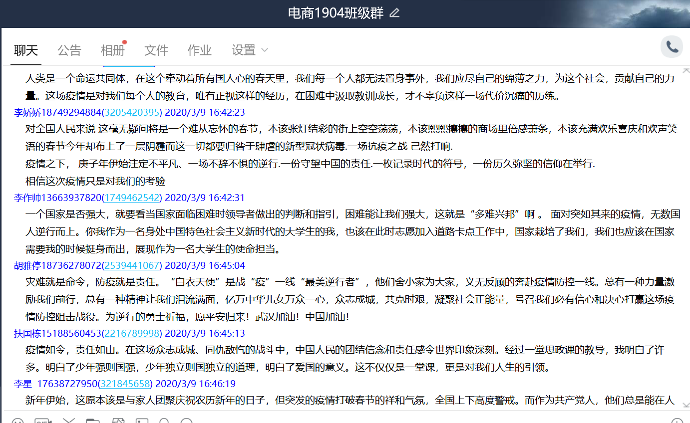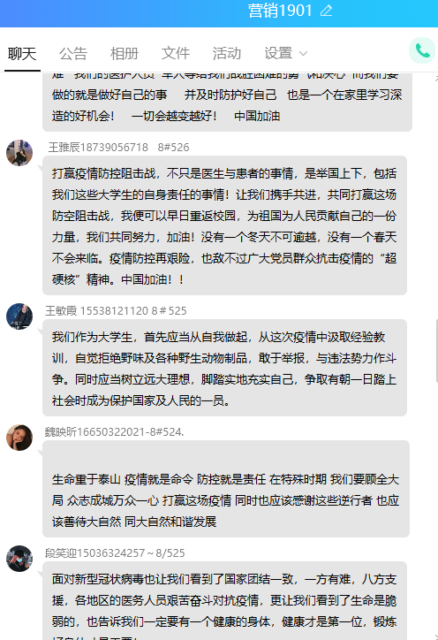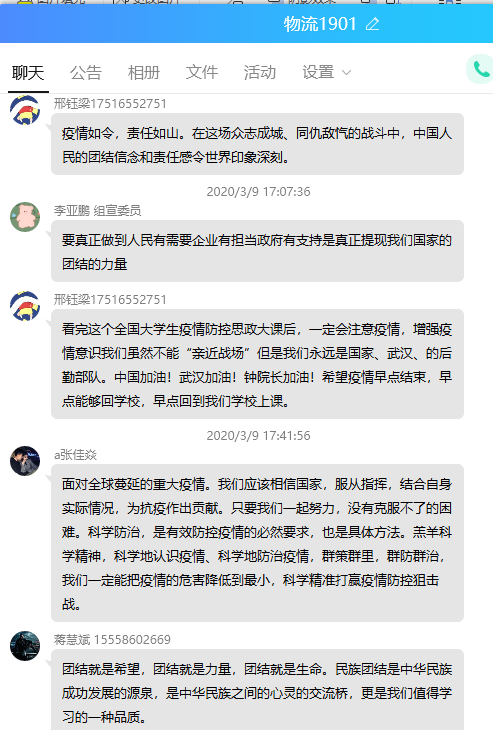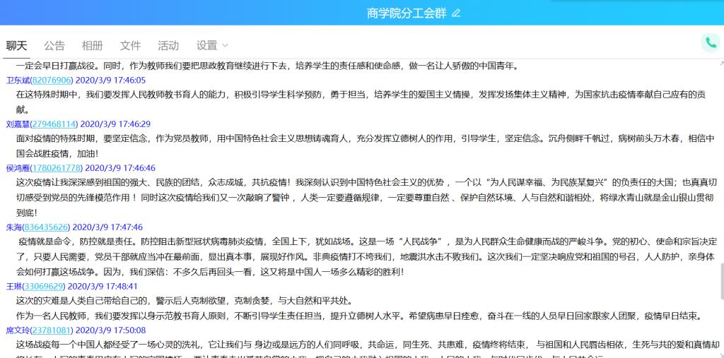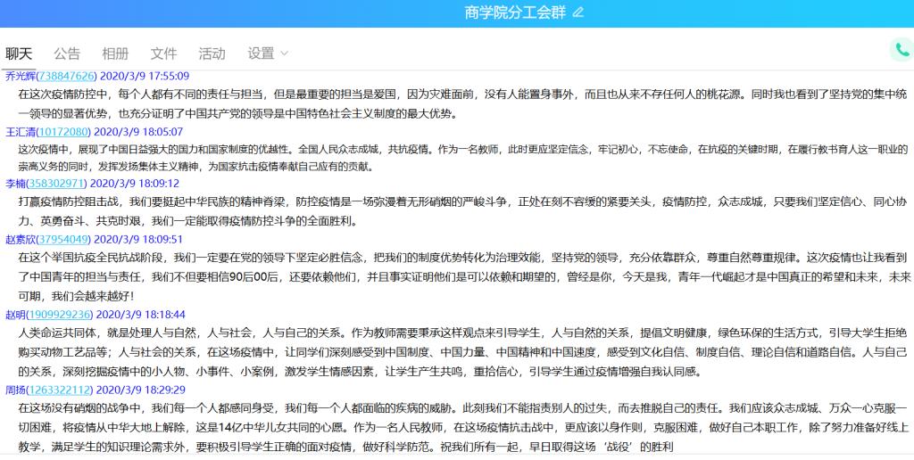 本次“同上一堂疫情防控思政大课”yl6809永利官网集团共有28名教师,1531名学生参与观看,其中教师28人均参与了讨论发言,yl6809永利官网集团共计41个班级在QQ群、微信群、在线课堂等渠道开展了讨论和发言。