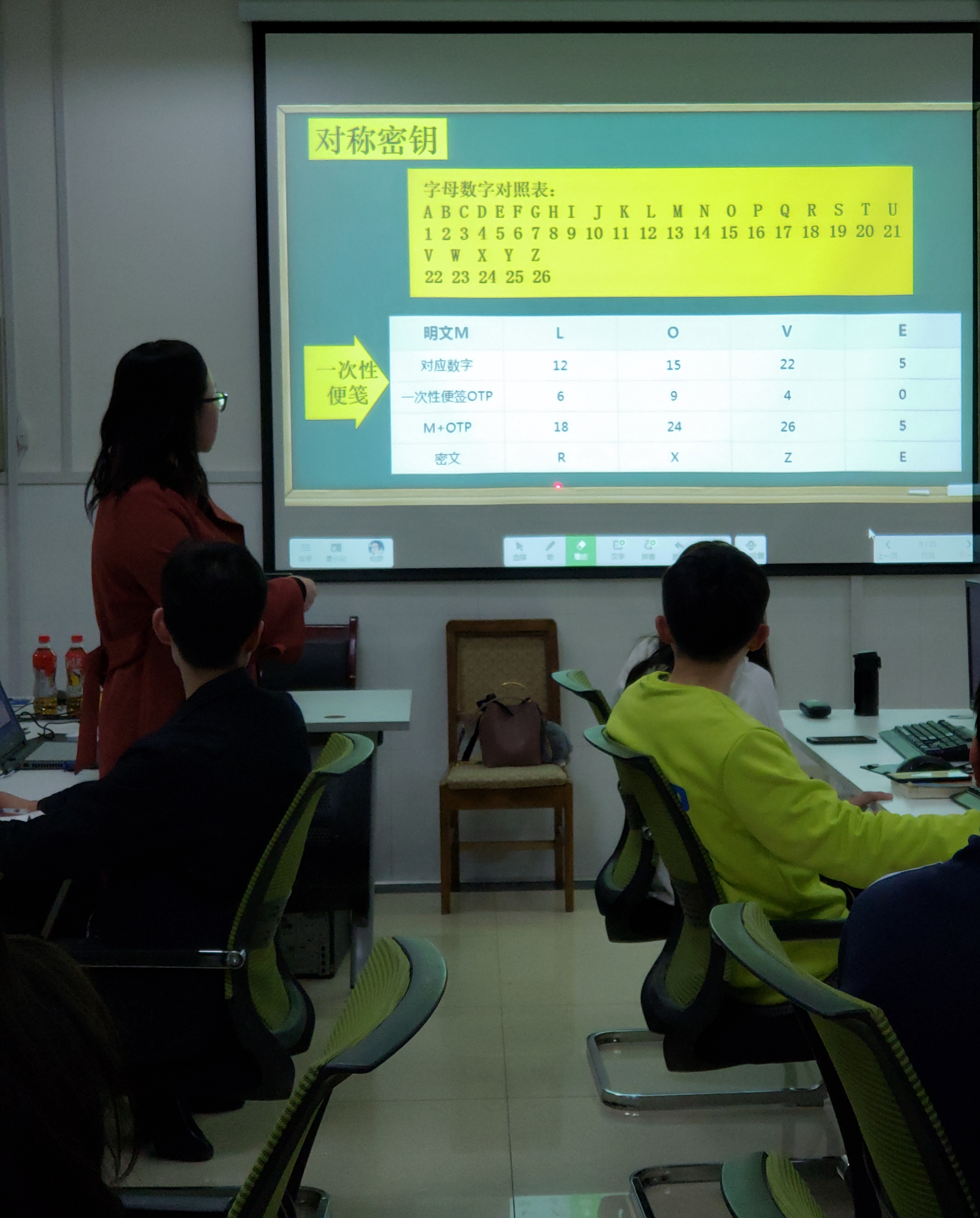 在讲到非对称密钥的时候,吴老师给两个小组同学和听课老师小组准备了一个有趣的任务“越过熊孩子的加密信”。同学们完成小组任务后,吴老师顺势总结两种加密技术的优缺点,并解释二者的有效结合正是破解任务的关键——电子信封。