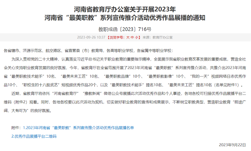 此次河南省开展“最美职教”系列的宣传推广活动,是为了展示我省职业教育的发展成果,助力职业教育社会形象与影响力的提升。此次我院入选的两项成果,无疑显示出了我院在职业教育方面取得的新成就,同时也充分肯定了我院将素质教育和职业技能训练有机地融合在一起的成功探索。