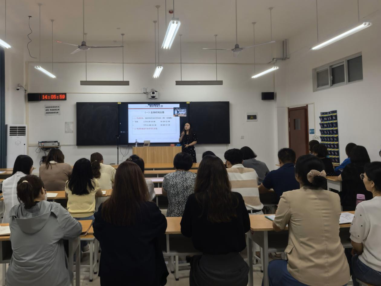 会上,施雨静对本次期末考试的时间规划、考场布置、场次安排、监考人员职责、试卷批改及成绩录入等具体事务展开详细介绍。她强调,在考试过程中,要密切关注学生的考试状态,及时处理各类突发情况;考试结束后,要认真核对试卷数量,确保试卷无遗漏、无错装等。随后,王珂对本次期末考试提出总体要求,她强调,期末考试是检验教学成果的关键环节,关乎学生的学业发展与学院的教学质量,全体监考教师务必严格依照考试规定履行职责,全力保障考试进程的公正、公平、有序。