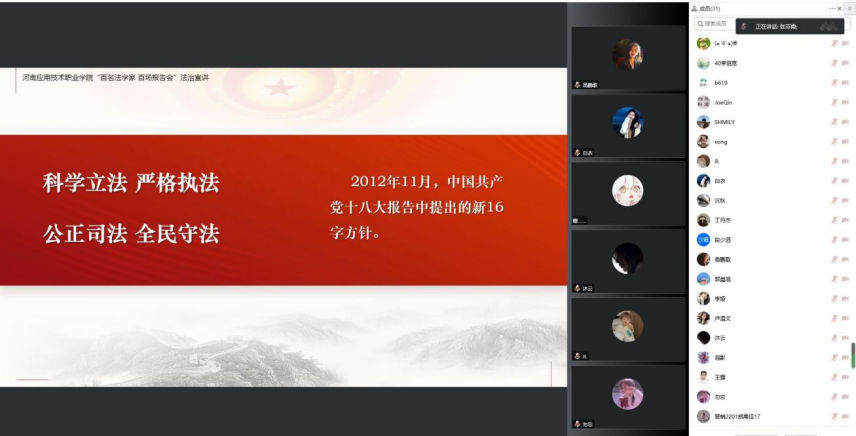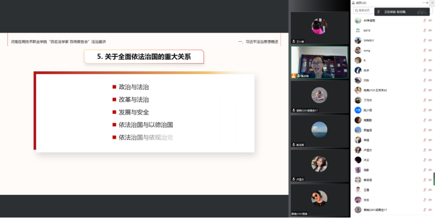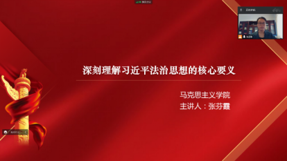 张芬霞老师主要从习近平法治思想概述、坚持以人民为中心的根本立场、坚持党对全面依法治国的领导、坚持中国特色社会主义法治道路以及法治思想重要环节五个方面进行理论宣讲,本次法治宣讲张老师深入浅出的对习近平法治思想的核心要义进行解读,让学生更深入的了解在中国共产党的领导下,我国社会主义法治建设取得的重大成就,以及对社会主义法治建设彰显的以人民为中心的发展思想有了更加深刻的认知。讲座结束后,张芬霞老师线上与学生进行了亲切互动,活跃了课堂气氛,提升学生的获得感,针对学生提出的一些法治思想问题,张芬霞老师也进行认真分析和耐心解答。