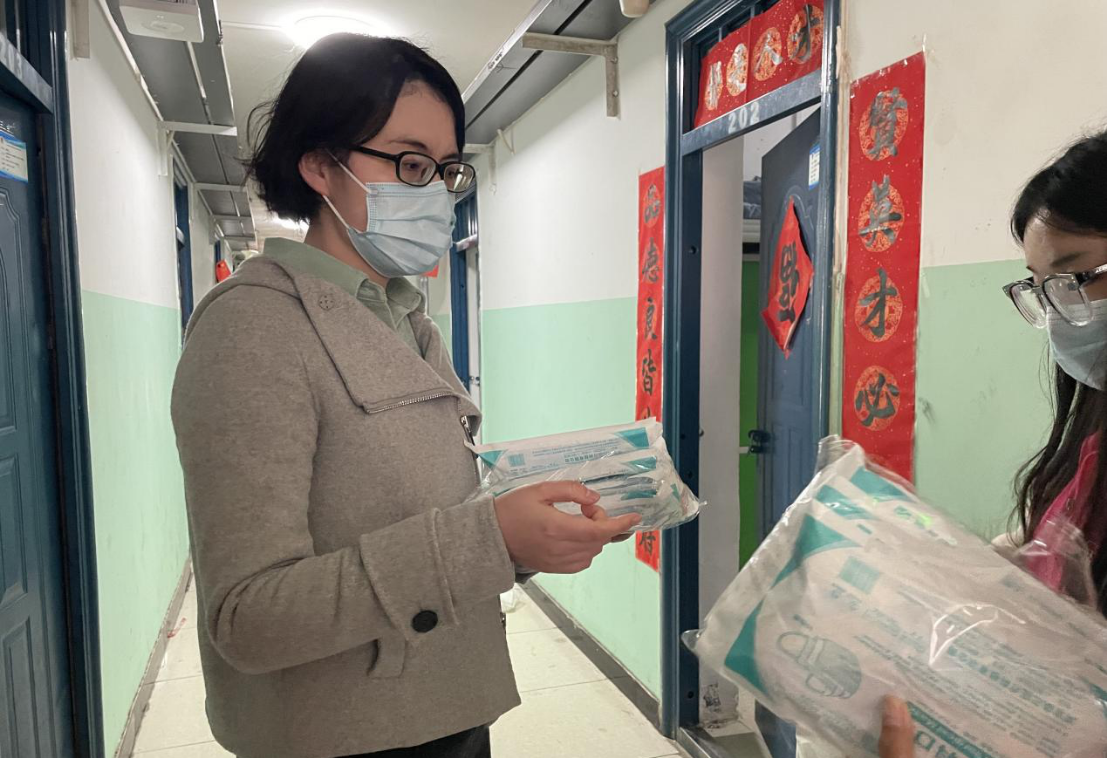 学生会干事为同学们分发口罩