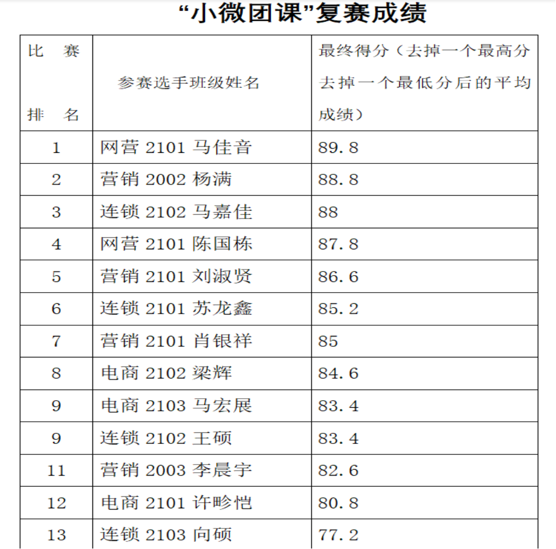 比赛过程如火如荼,异常激烈。十几个小微团课的展示让同学们感受了不同形式、不同主题的团课在内容上的深化和形式上的创新。选手们带领大家共同了解了30万林州人民苦战10个春秋,靠着一锤,一铲,两只手,在太行山悬崖峭壁上创作出“自力更生、艰苦创业、团结协作、无私奉献”红旗渠精神的故事;学习习近平新时代中国特色社会主义思想和党的十九大精神,坚定了大家同心同德,凝心聚力为实现第二个百年奋斗目标不懈努力奋斗的铿锵斗志,还有学团史、讲传统文化、致敬焦裕禄精神等主题展示,在选手们的精彩讲解下,观众们纷纷表示受益良多。经过激烈角逐,最终比赛结果排名如下:
