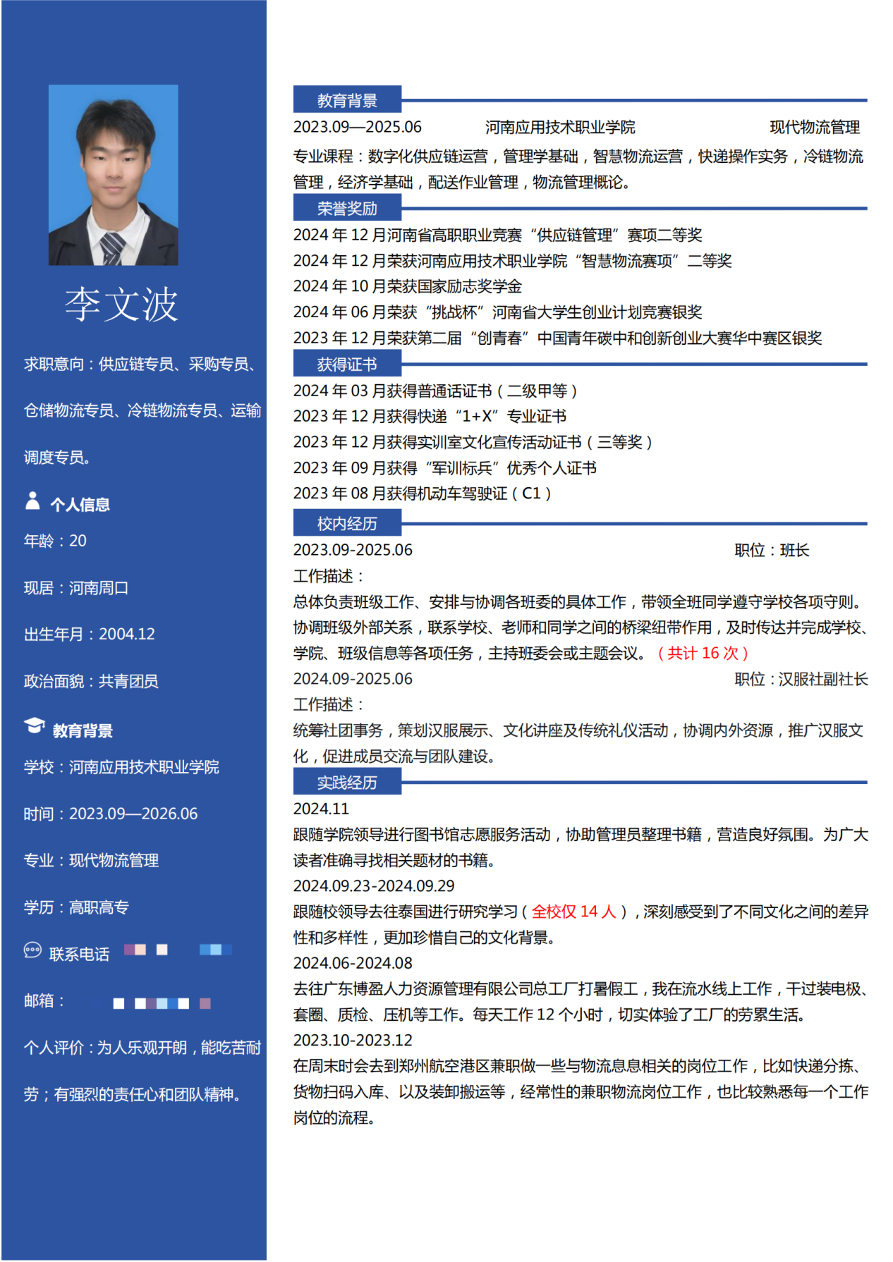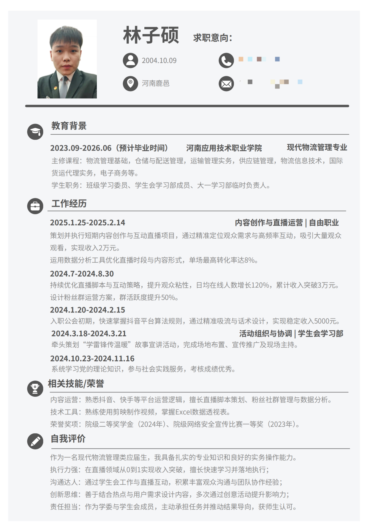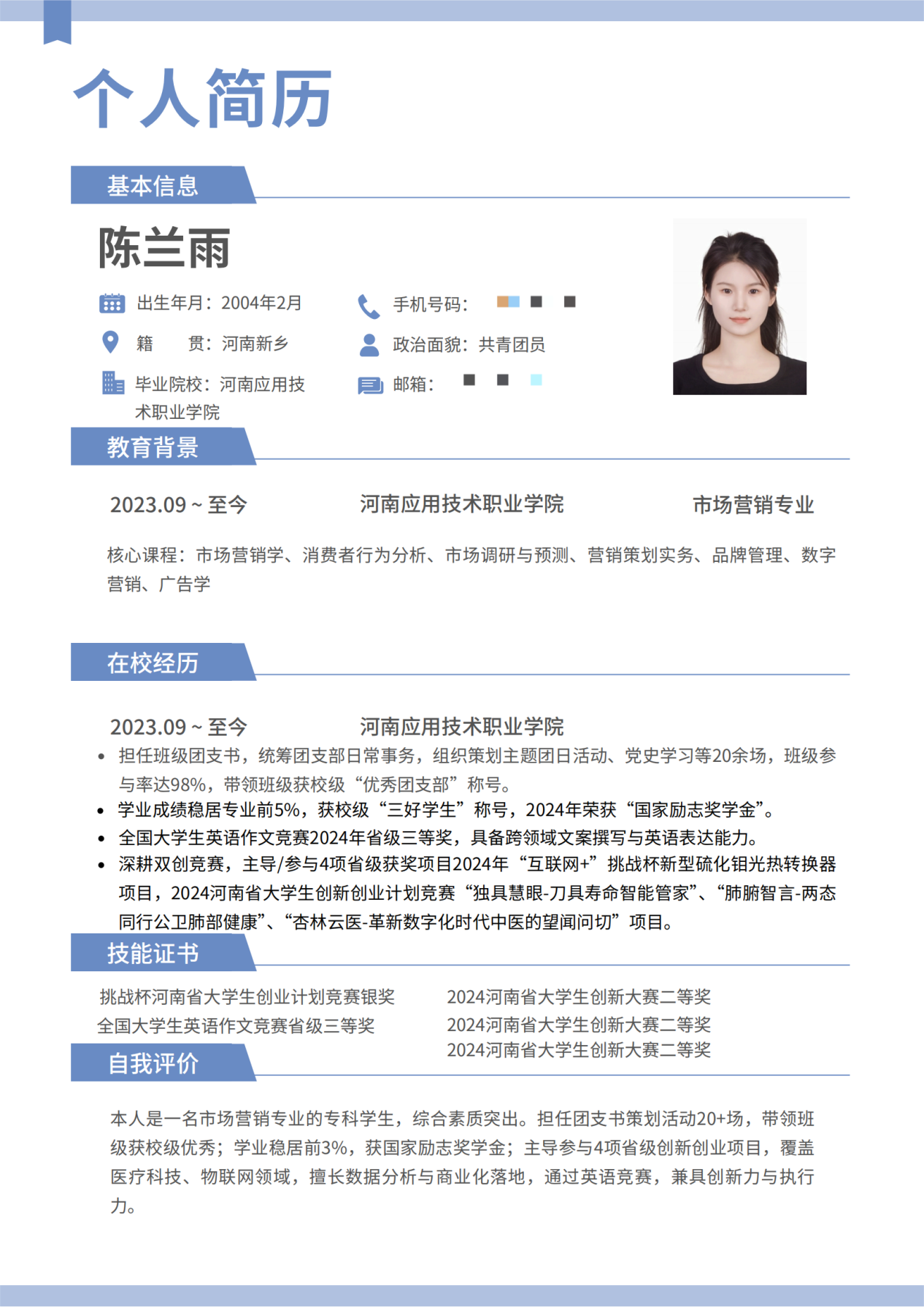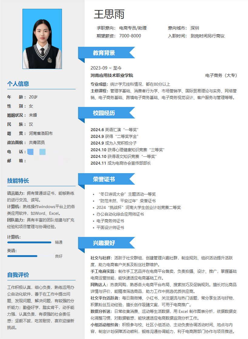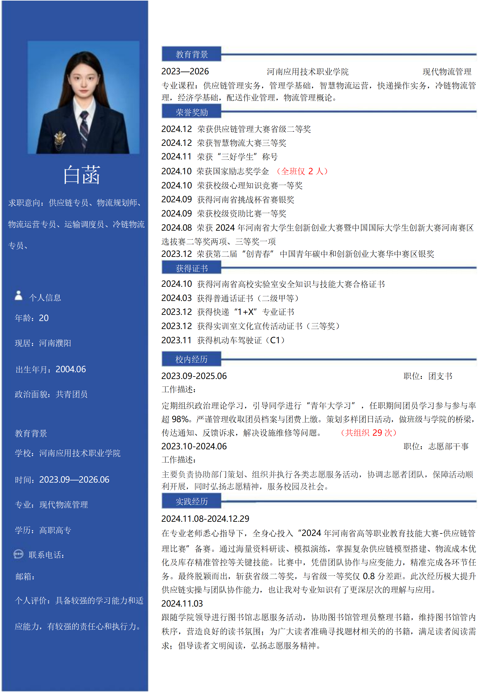 此次简历设计制作大赛圆满收官,不仅有效帮助同学们系统掌握简历设计规范与撰写核心技巧,更激发了大家的创新思维。参赛作品中,同学们充分发挥创意,将专业素养与个人风格深度融合,呈现出兼具视觉美感与信息价值的优秀成果。现在,就让我们一同领略部分获奖作品的独特魅力吧!