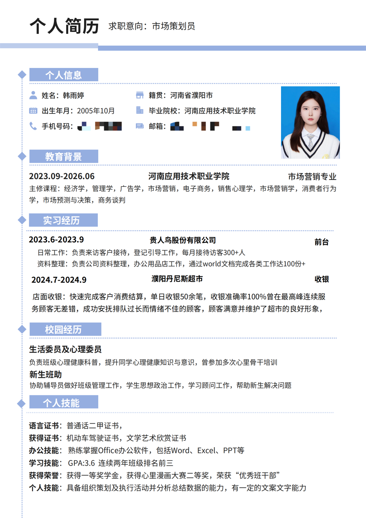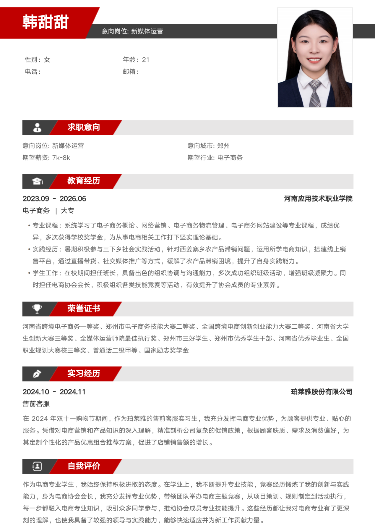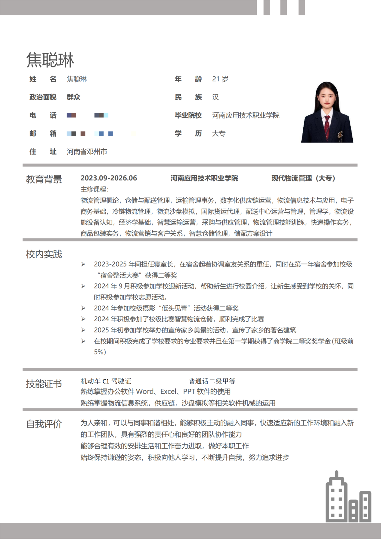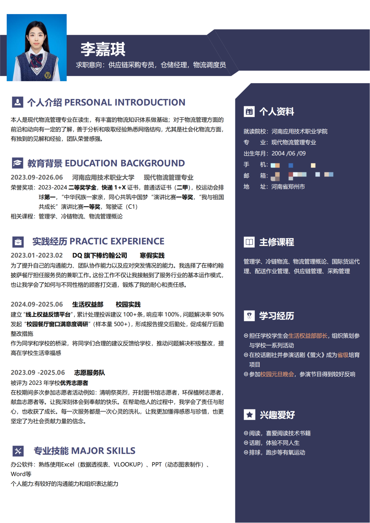 此次简历设计制作大赛圆满收官,不仅有效帮助同学们系统掌握简历设计规范与撰写核心技巧,更激发了大家的创新思维。参赛作品中,同学们充分发挥创意,将专业素养与个人风格深度融合,呈现出兼具视觉美感与信息价值的优秀成果。现在,就让我们一同领略部分获奖作品的独特魅力吧!