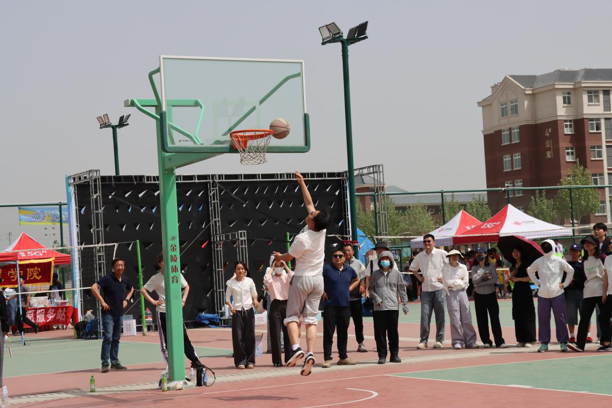 教职工趣味比赛成为赛场别样的风景线。比赛项目丰富,包含毛毛虫、运球上篮和集体跳大绳。毛毛虫比赛中,教职工分组骑在“毛毛虫”道具上,喊着口号奋力前冲,赛场氛围热烈;运球上篮时,老师们运球跑并投篮,有人动作娴熟,有人虽显慌乱却坚持完成比赛;跳大绳时,两位老师摇绳,其余老师依次跳绳,节奏把握良好,整个趣味赛充分展现了教职工积极向上的精神风貌。