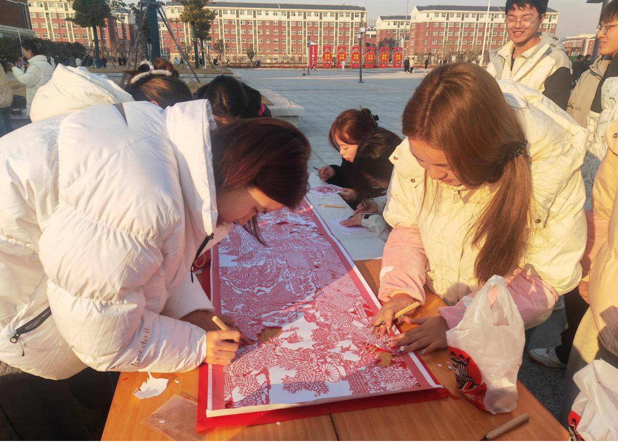 活动中,活字印刷,手工缠花,捏面人等活动精彩纷呈,参与师生可以亲身体验活字印刷术,亲手排版、涂墨、印刷,感受古人的智慧在指尖流淌,见证文字的灵动诞生。制作过程中,学院老师对宋文化进行了深入浅出的讲解,同学们纷纷表示受益匪浅。此外,捏面人、手工缠花和清明上河图剪纸,也吸引了大量学生积极参与,进一步激发了同学们对宋代文化艺术的热情与喜爱。