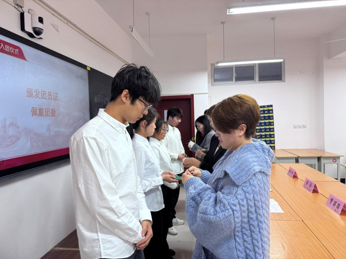 在热烈的掌声中,庞轶老师、贺苗苗老师、董会老师、张天娇老师依次为现场新团员佩戴团徽徽章、颁发团员证。