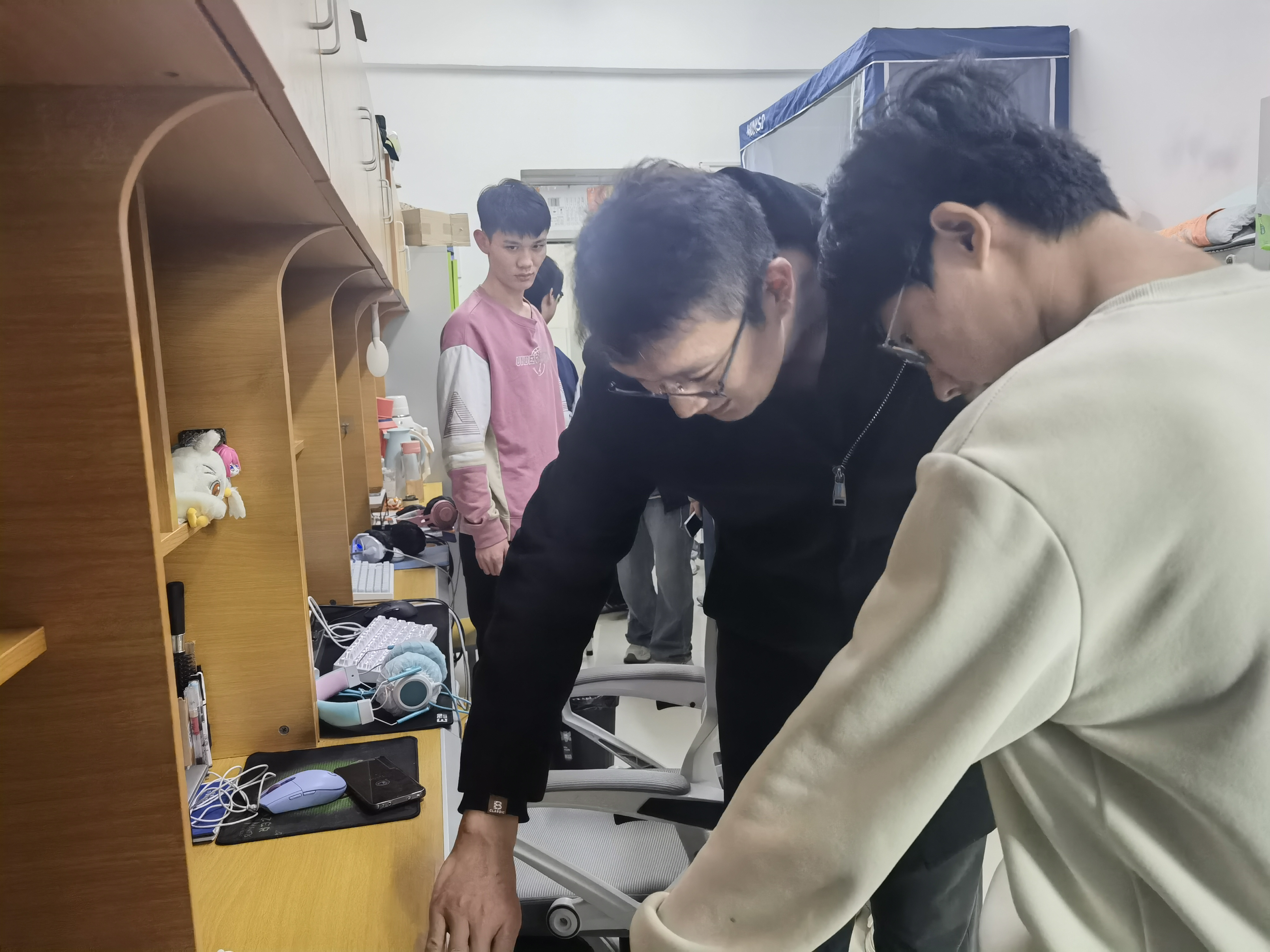 荆伟科一行重点围绕大功率违规电器使用、私拉乱接电线、插线板充电过载、易燃易爆物品存放等安全隐患展开细致检查,同时核查宿舍楼道内消防通道畅通情况,以及应急照明设施是否完好。排查过程中,荆伟科与辅导员们仔细查看电路老化程度、电器使用合规性等情况,向学生反复强调“人走灯灭、人走断电”的安全准则,引导学生从思想上重视消防安全,主动树立自主防范意识,提升自我安全管理能力。