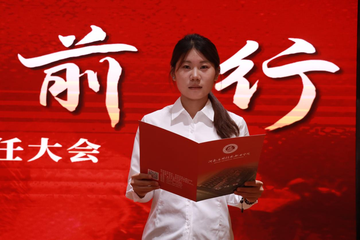 新老学生干部代表先后发言,2023级学生干部代表黄莉媛以“服务中践行成长”为核心,分享了带领团队推进师生协作的实践经历,强调学生干部需以担当为纽带,搭建好师生沟通桥梁;2024级新任学生干部代表张彤从学生会职能认知、未来工作规划及职业态度三个维度庄严表态,承诺以务实作风接棒使命,展现新生代的责任担当。