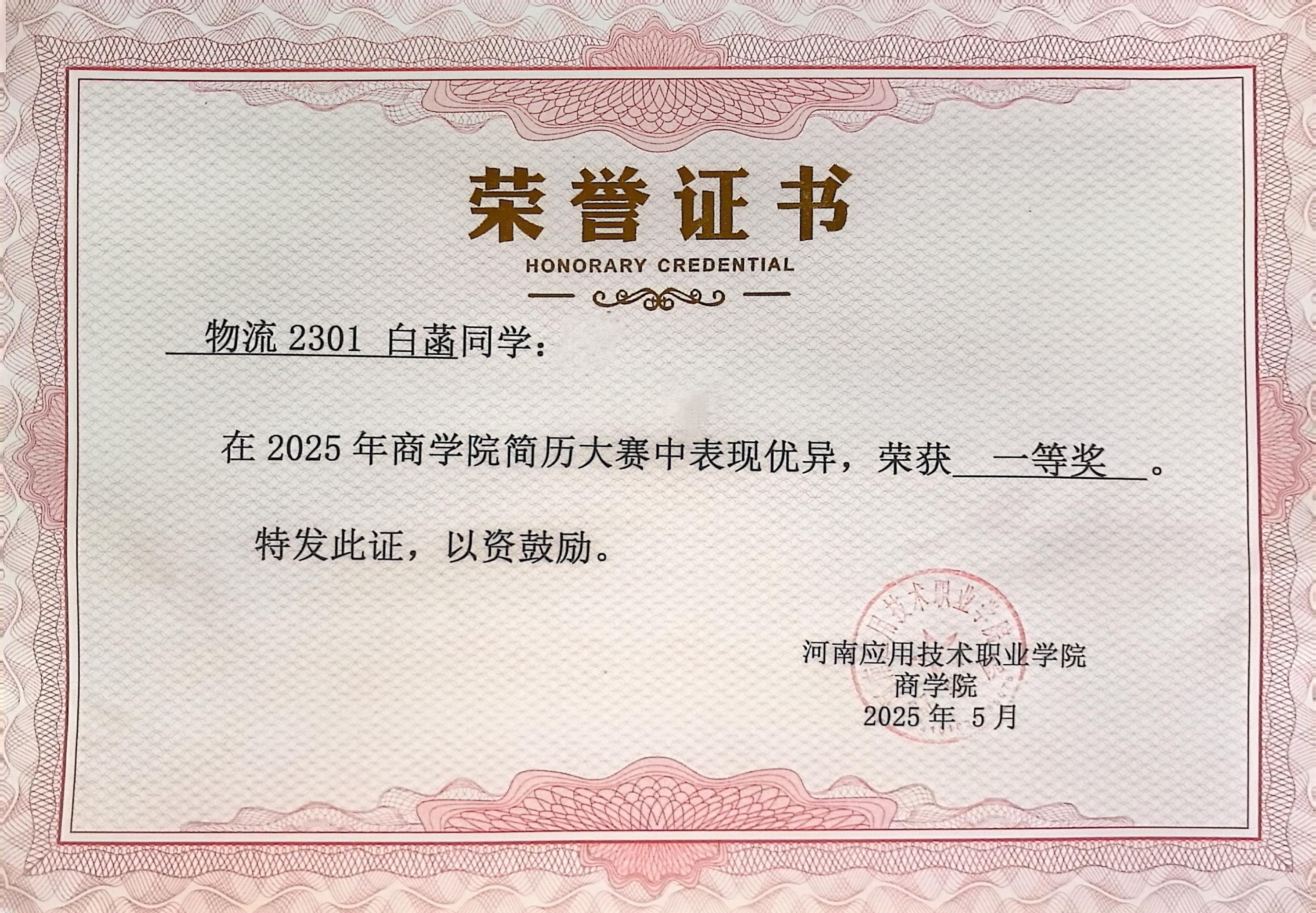 个人简历:白菡,女,中共预备党员,yl6809永利官网集团现代物流管理专业物流2301班学生。作为新时代大学生,她始终以“深耕专业、全面发展、勇于担当”为目标,在专业学习中精益求精,在学科竞赛中屡创佳绩,在社会实践中锤炼品格,累计斩获省级以上奖项9项、校级奖项4项,考取英语四级、普通话二级甲等证书,以扎实的专业素养、突出的创新能力与强烈的社会责任感,书写了新时代青年的奋进答卷。