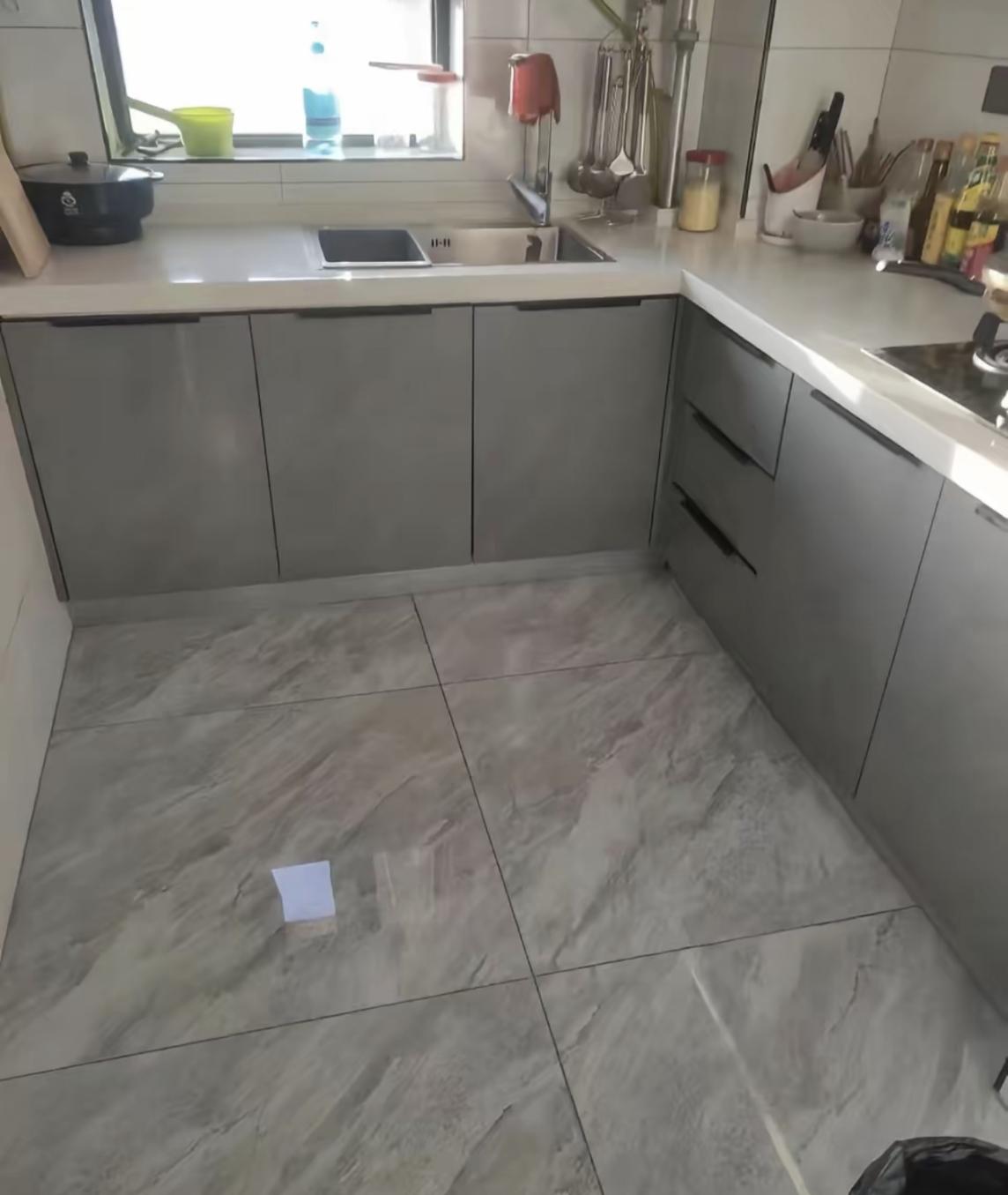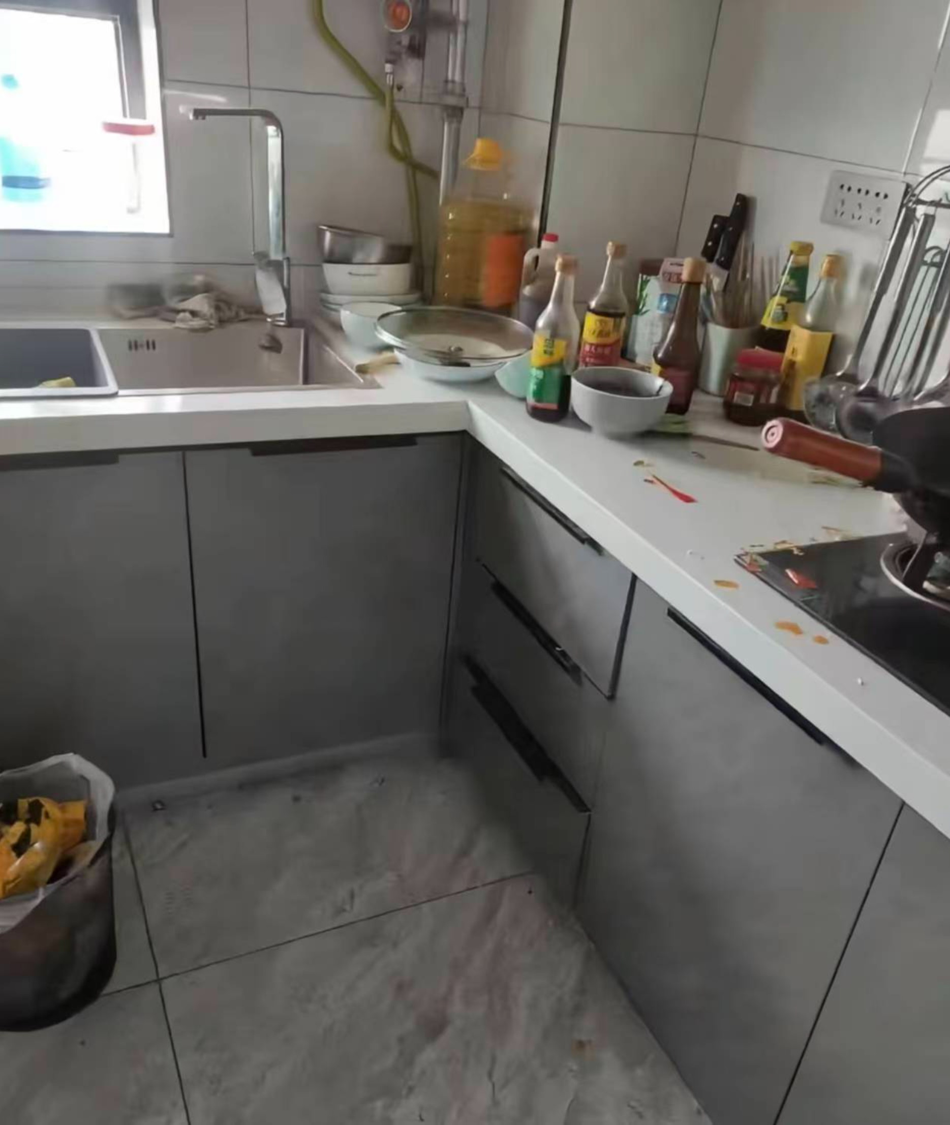 灶台边缘积存油渍,调味瓶罐摆放失序,洗菜池周边可见明显水垢沉积,地面零星散落食材碎屑。空间功能虽在,却失了几分明净。