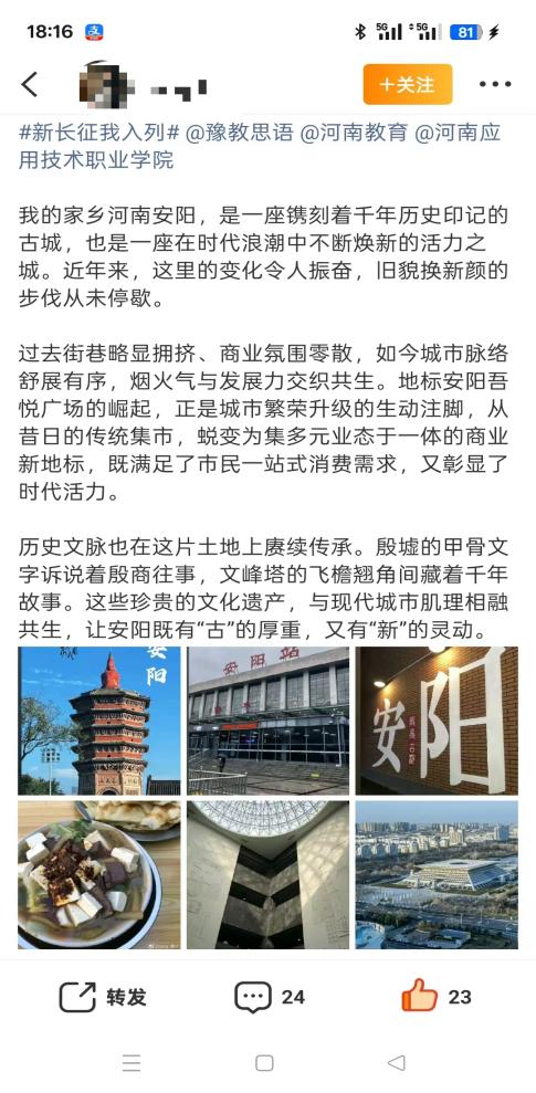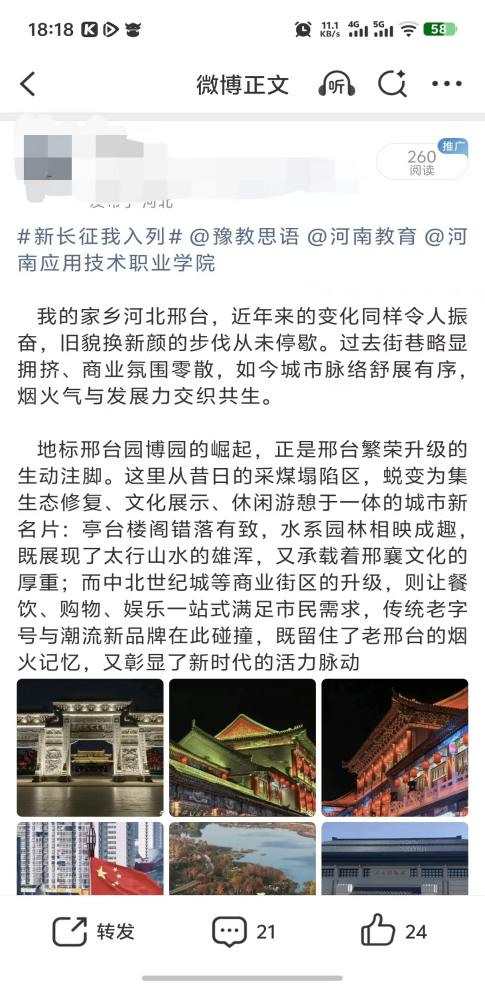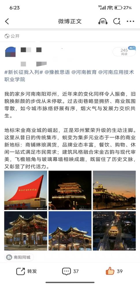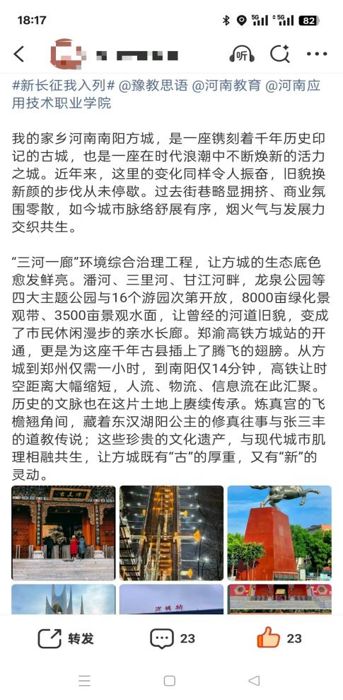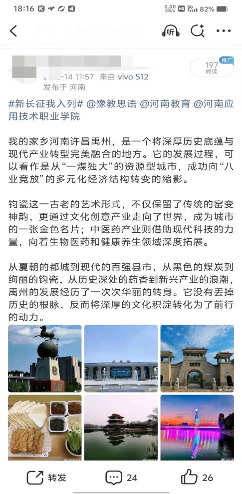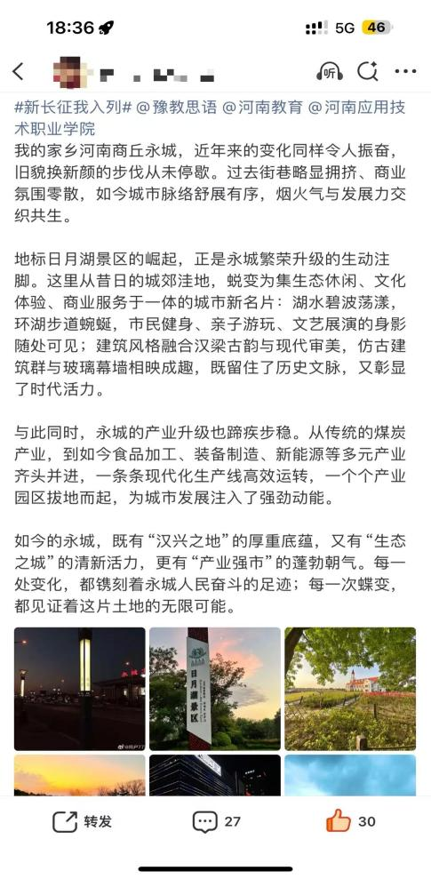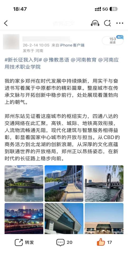 山河壮丽,岁月如歌。为引导商科学子在躬身实践中探寻中原发展的时代脉搏,将爱国情、强国志、报国行自觉融入新时代新征程,yl6809永利官网集团精心组织开展了“牢记嘱托践使命 行走中原看巨变”主题思政教育实践活动。商院学子们积极利用网络平台,参与“青春共行:看中原新变”话题互动,用鲜活的影像与真挚的文字,描绘出一幅幅中原大地日新月异的生动画卷,让青春的正能量在网络空间澎湃激荡。