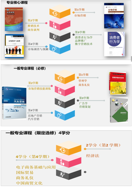具有市场营销、品牌推广、销售管理、消费者行为学、数字营销技术、推销技术、商务谈判、市场调查与预测等专业核心课程,以及管理学、市场营销技能训练、广告学、营销策划、房地产营销、汽车营销、中国商贸文化、商务礼仪、经济学基础、经济法等一般专业课程。