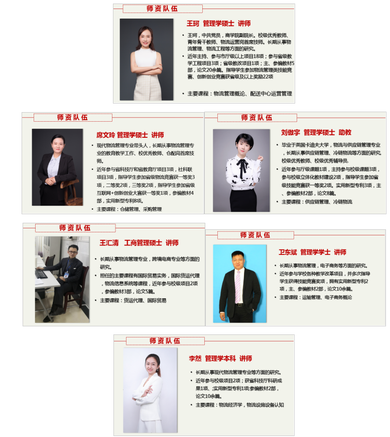 现代物流管理专业有专业课教师6名,其中,讲师5人,硕士研究4人,是一支年轻、充满活力与创新精神的团队。