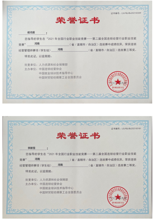 2021年连锁经营管理师省级二等奖1项、三等奖1项