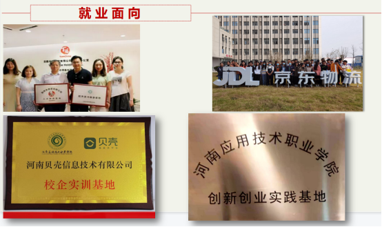 与郑州九六一电子商务有限公司、郑州金鹏电子商务有限公司、郑州君轩互联网上网服务有限公司、河南商景营销策划有限公司、河南新世纪拓普电子科技有限公司、汝瓷网、神州数码科技有限公司、郑州名美化妆品有限公司、郑州市瑞光恒业科技有限公司、河南易居房地产顾问有限公司、郑州保利房地产营销策划有限公司、郑州蜗居房地产营销策划有限公司、郑州鸿业医疗科技发展有限公司等密切合作,确保学生高质量顶岗实习,就业无忧!